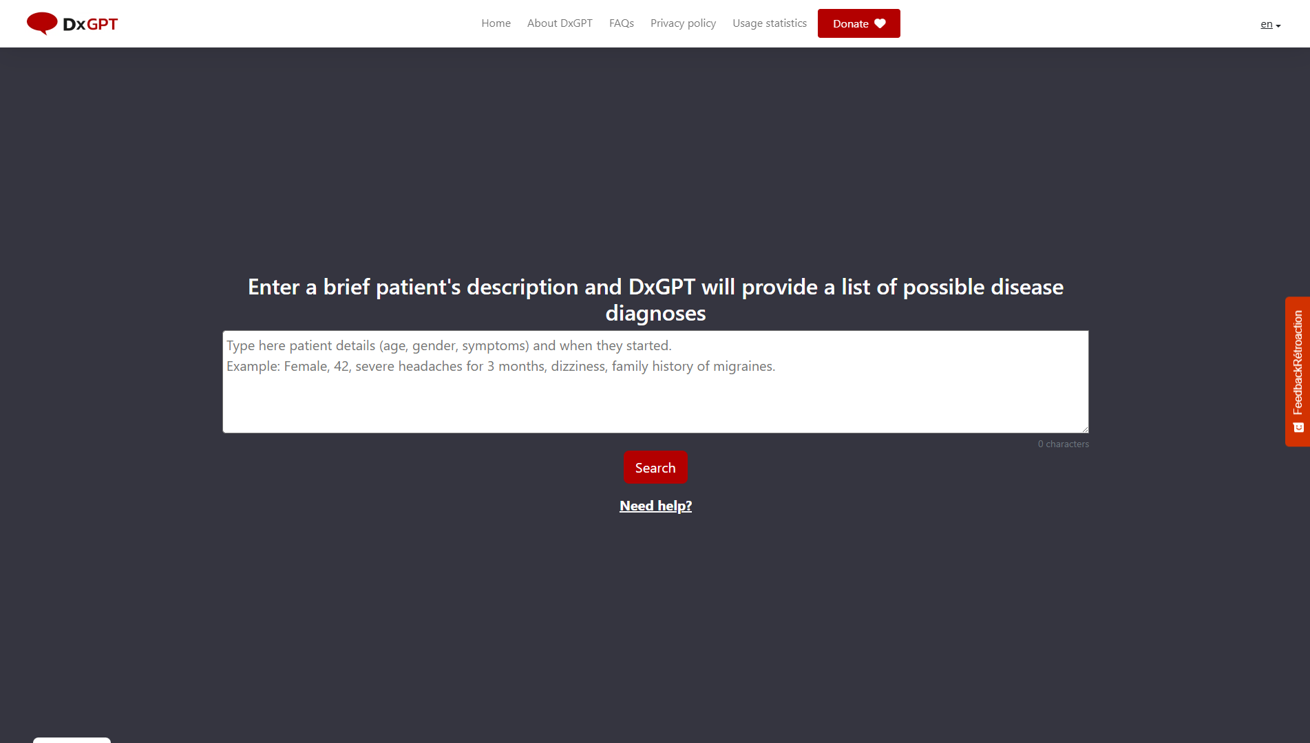 AccéderEntrez une brève description du patient et DxGPT vous fournira une liste de diagnostics de maladie possibles.
