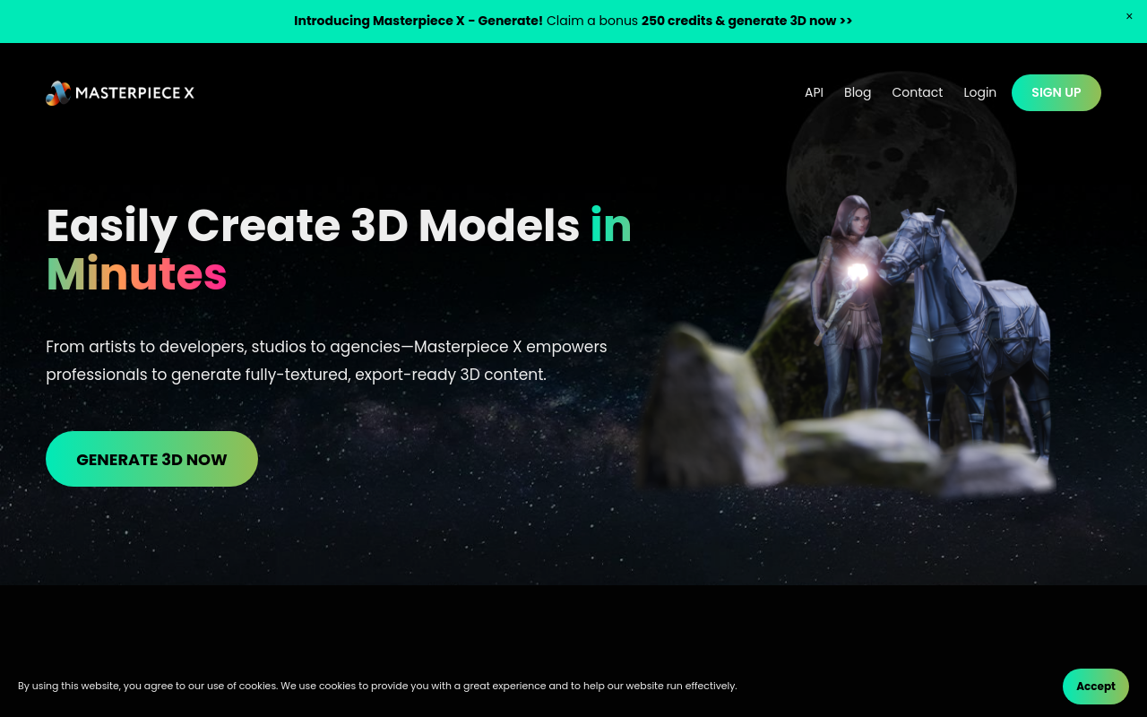 AccéderTransforme des textes ou images en modèles réalistes, texturés et prêts à l’emploi en quelques minutes. Automatise la création (texturage, rigging, animation), qu’il s’agisse de générer un personnage à partir de quelques mots ou de concevoir des environnements complexes