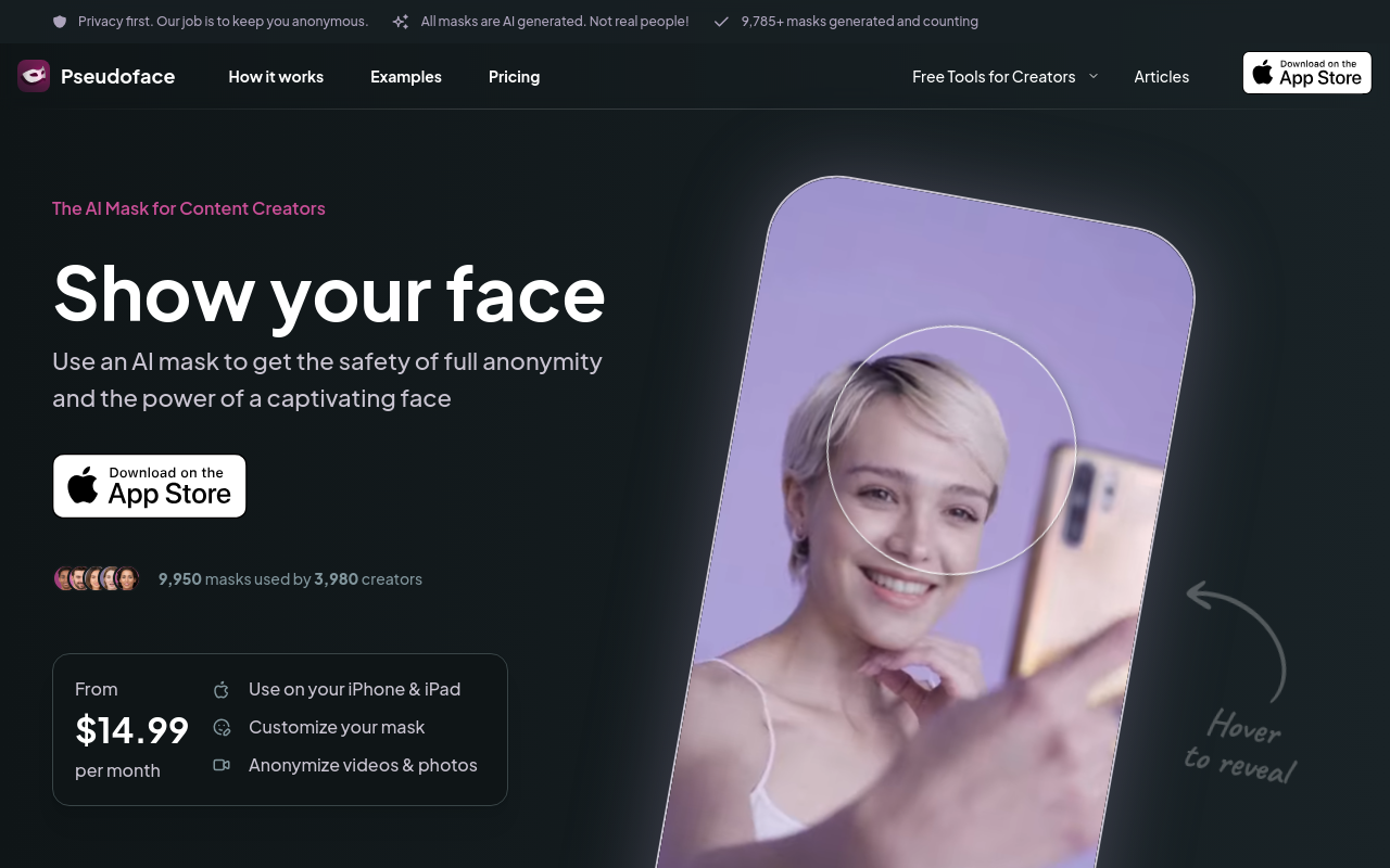 AccéderApplication AI conçue pour les créateurs de contenu souhaitant préserver leur anonymat grâce a des masques virtuels.